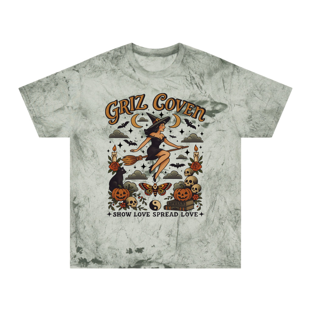 custom made GRIZ COVEN 'show love spread love" limited edition halloween design by SOUNDWAVE CLOTHING printed on a olive green tie dye t-shirt