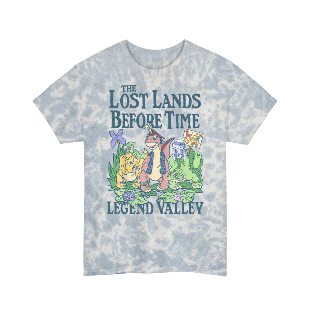 custom made LOST LANDS x Land Before Time flip custom made by SOUNDWAVE CLOTHING design printed on a cloudy blue tie dye t-shirt